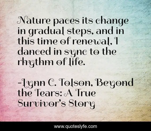 This page presents the quote "Nature paces its change in gradual steps, and in this time of renewal, I danced in sync to the rhythm of life.". Author of this quote is Lynn C. Tolson, Beyond the Tears: A True Survivor's Story. This quote is about confidence, recovery, dance, positive, motivational, optimistic, inspirational, enthusiasm,.