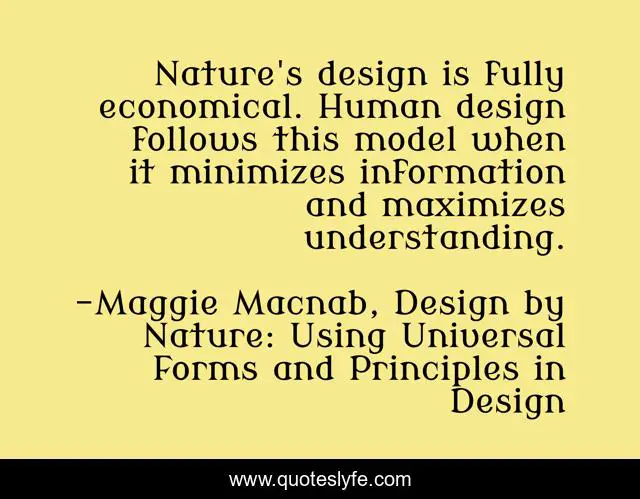 "Maggie Macnab, Design by Nature: Using Universal Forms and Principles in Design Quotes." Quoteslyfe.com, 2025. Sat. 06 Dec. 2025. <https://www.quoteslyfe.com/quote/Nature-s-design-is-fully-economical-Human-72851>.