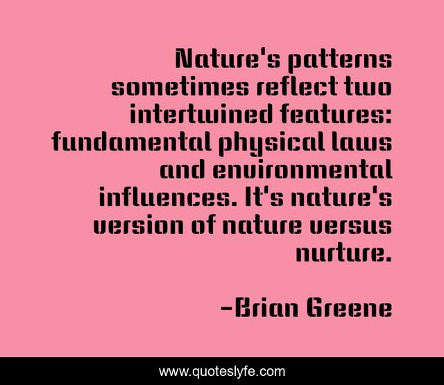 This page presents the quote "Nature's patterns sometimes reflect two intertwined features: fundamental physical laws and environmental influences. It's nature's version of nature versus nurture.". Author of this quote is Brian Greene. This quote is about nurture, nature, laws,.