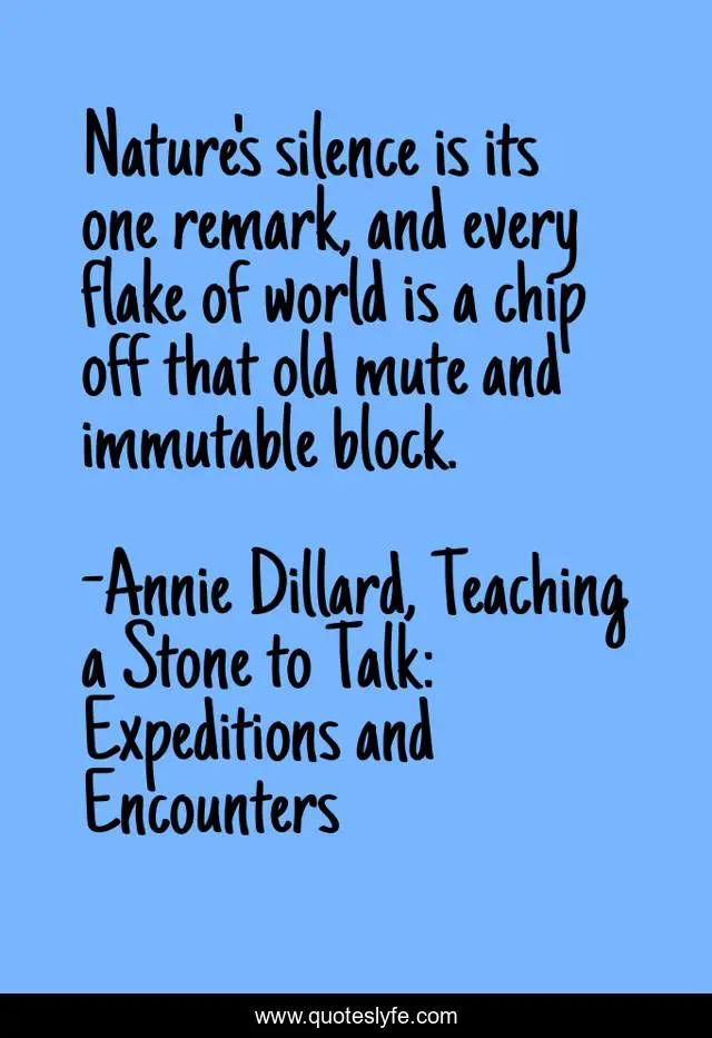 "Annie Dillard, Teaching a Stone to Talk: Expeditions and Encounters Quotes." Quoteslyfe.com, 2025. Fri. 05 Dec. 2025. <https://www.quoteslyfe.com/quote/Nature-s-silence-is-its-one-remark-72375>.