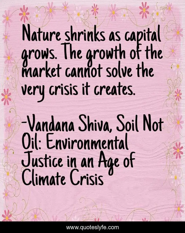 "Vandana Shiva, Soil Not Oil: Environmental Justice in an Age of Climate Crisis Quotes." Quoteslyfe.com, 2025. Mon. 08 Dec. 2025. <https://www.quoteslyfe.com/quote/Nature-shrinks-as-capital-grows-The-growth-230660>.