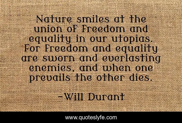 This page presents the quote "Nature smiles at the union of freedom and equality in our utopias. For freedom and equality are sworn and everlasting enemies, and when one prevails the other dies.". Author of this quote is Will Durant. This quote is about freedom, equality,.