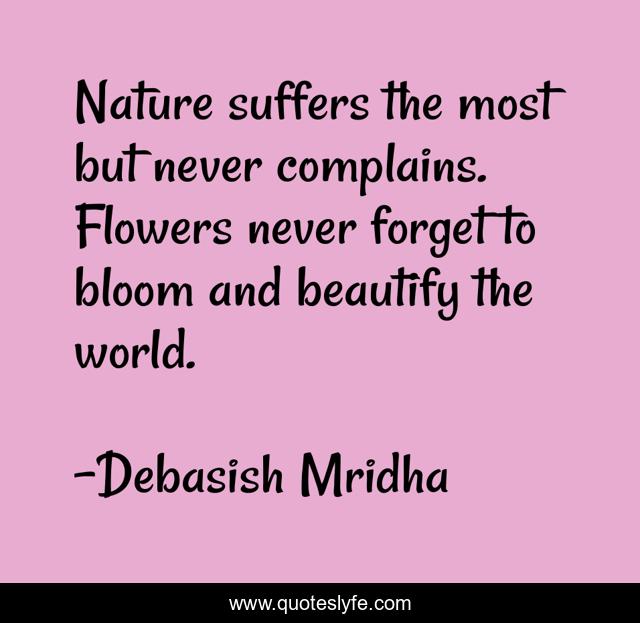 This page presents the quote "Nature suffers the most but never complains. Flowers never forget to bloom and beautify the world.". Author of this quote is Debasish Mridha. This quote is about debasish, nature, mridha, philosophy, debasish-mridha, beautify-the-world, inspirational, enthusiasm, flowers,.