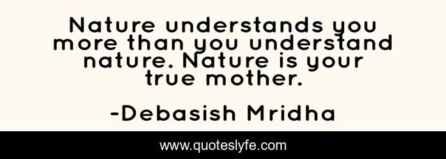 This page presents the quote "Nature understands you more than you understand nature. Nature is your true mother.". Author of this quote is Debasish Mridha. This quote is about understands, debasish, nature, mridha, philosophy, debasish-mridha, nature-understands, true-mother,.