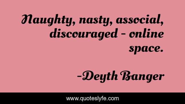 This page presents the quote "Naughty, nasty, associal, discouraged - online space.". Author of this quote is Deyth Banger. This quote is about associal, nasty, online, space,.