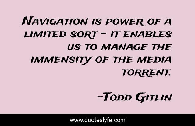 This page presents the quote "Navigation is power of a limited sort - it enables us to manage the immensity of the media torrent.". Author of this quote is Todd Gitlin. This quote is about media, navigation, us,.