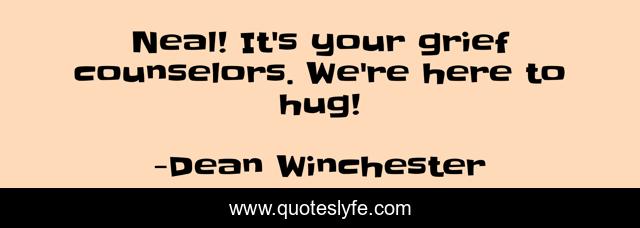 This page presents the quote "Neal! It's your grief counselors. We're here to hug!". Author of this quote is Dean Winchester. This quote is about supernatural, dean-winchester,.