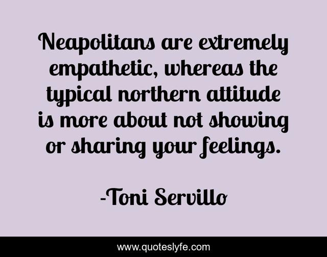 This page presents the quote "Neapolitans are extremely empathetic, whereas the typical northern attitude is more about not showing or sharing your feelings.". Author of this quote is Toni Servillo. This quote is about sharing, feelings,.