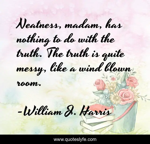 This page presents the quote "Neatness, madam, has nothing to do with the truth. The truth is quite messy, like a wind blown room.". Author of this quote is William J. Harris. This quote is about messy, neatness, life, truth,.