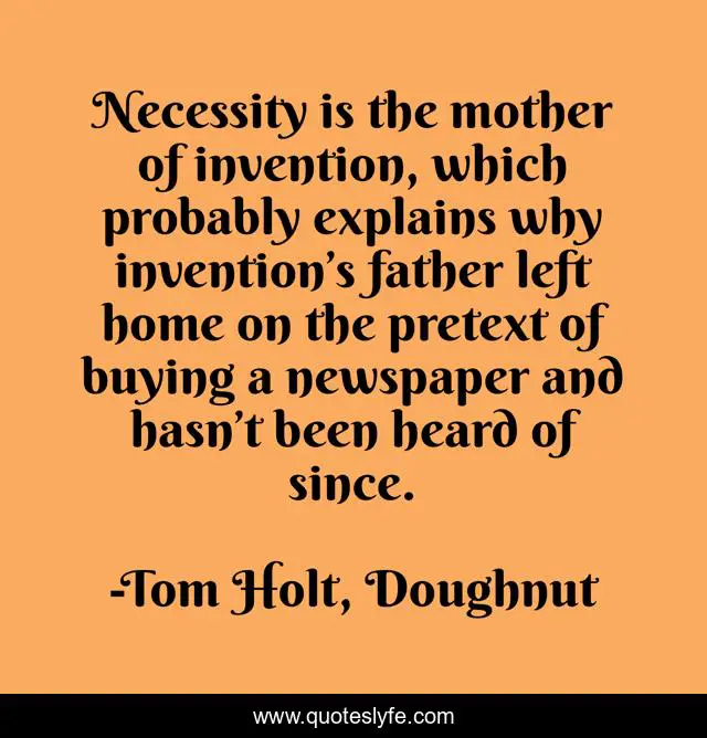 This page presents the quote "Necessity is the mother of invention, which probably explains why invention’s father left home on the pretext of buying a newspaper and hasn’t been heard of since.". Author of this quote is Tom Holt, Doughnut. This quote is about fantasy, humor, science-fiction,.