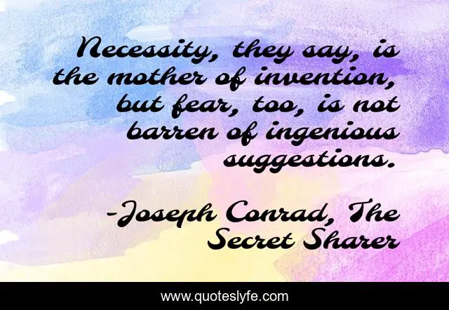 This page presents the quote "Necessity, they say, is the mother of invention, but fear, too, is not barren of ingenious suggestions.". Author of this quote is Joseph Conrad, The Secret Sharer. This quote is about fear, invention, necessity,.