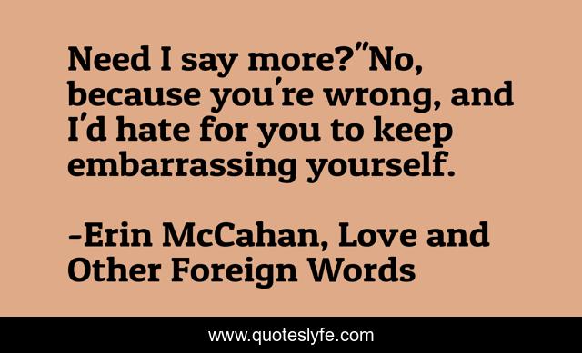 This page presents the quote "Need I say more?''No, because you're wrong, and I'd hate for you to keep embarrassing yourself.". Author of this quote is Erin McCahan, Love and Other Foreign Words. This quote is about embarassment, sarcasm,.