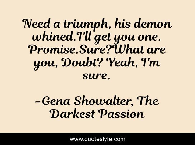 This page presents the quote "Need a triumph, his demon whined.I'll get you one. Promise.Sure?What are you, Doubt? Yeah, I'm sure.". Author of this quote is Gena Showalter, The Darkest Passion. .