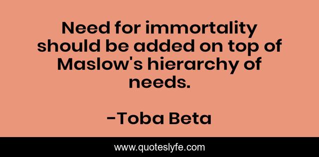 This page presents the quote "Need for immortality should be added on top of Maslow's hierarchy of needs.". Author of this quote is Toba Beta. This quote is about eternity, immortality, eternal, immortal,.