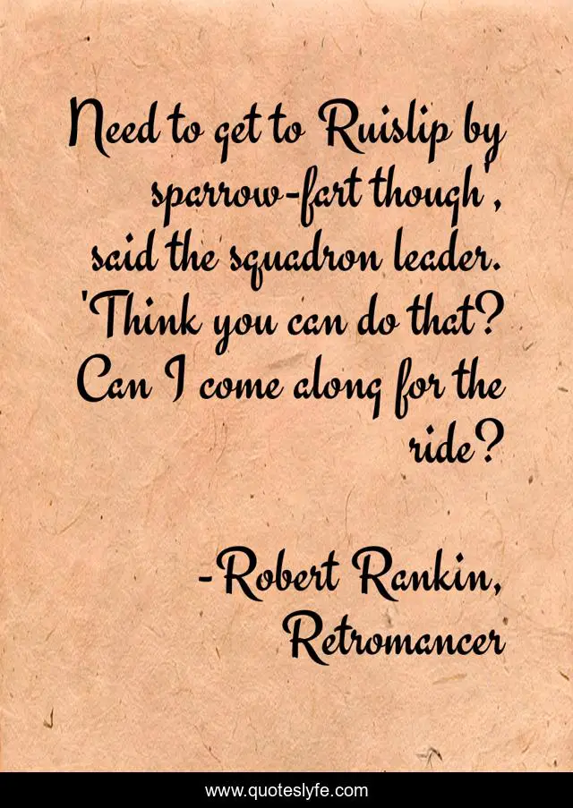 "Robert Rankin, Retromancer Quotes." Quoteslyfe.com, 2025. Fri. 05 Dec. 2025. <https://www.quoteslyfe.com/quote/Need-to-get-to-Ruislip-by-sparrow-55754>.