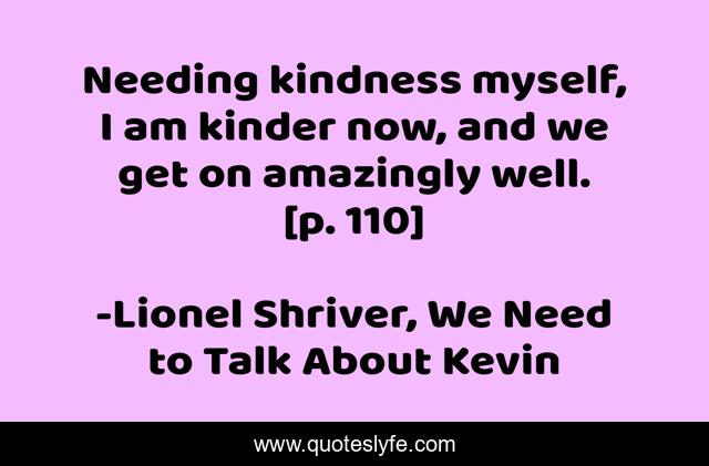This page presents the quote "Needing kindness myself, I am kinder now, and we get on amazingly well. [p. 110]". Author of this quote is Lionel Shriver, We Need to Talk About Kevin. .