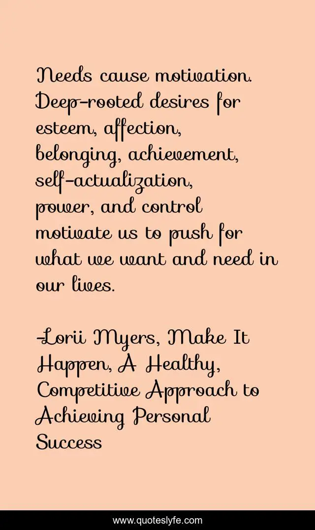 This page presents the quote "Needs cause motivation. Deep-rooted desires for esteem, affection, belonging, achievement, self-actualization, power, and control motivate us to push for what we want and need in our lives.". Author of this quote is Lorii Myers, Make It Happen, A Healthy, Competitive Approach to Achieving Personal Success. This quote is about desire, motivation, make-it-happen, achievement, affection, esteem,.