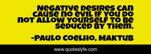 This page presents the quote "Negative desires can cause no evil if you do not allow yourself to be seduced by them.". Author of this quote is Paulo Coelho, Maktub. This quote is about enthusiasm, inspirational,.
