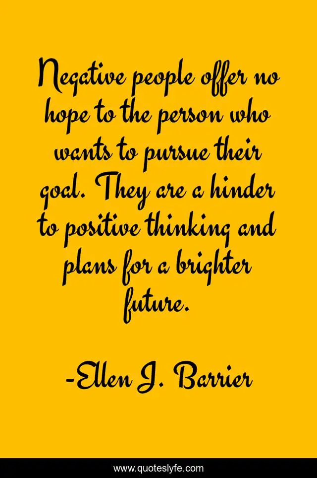 This page presents the quote "Negative people offer no hope to the person who wants to pursue their goal. They are a hinder to positive thinking and plans for a brighter future.". Author of this quote is Ellen J. Barrier. .