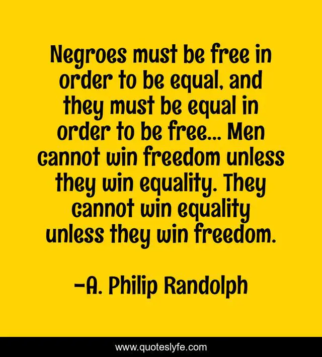 This page presents the quote "Negroes must be free in order to be equal, and they must be equal in order to be free... Men cannot win freedom unless they win equality. They cannot win equality unless they win freedom.". Author of this quote is A. Philip Randolph. This quote is about freedom, men, free,.