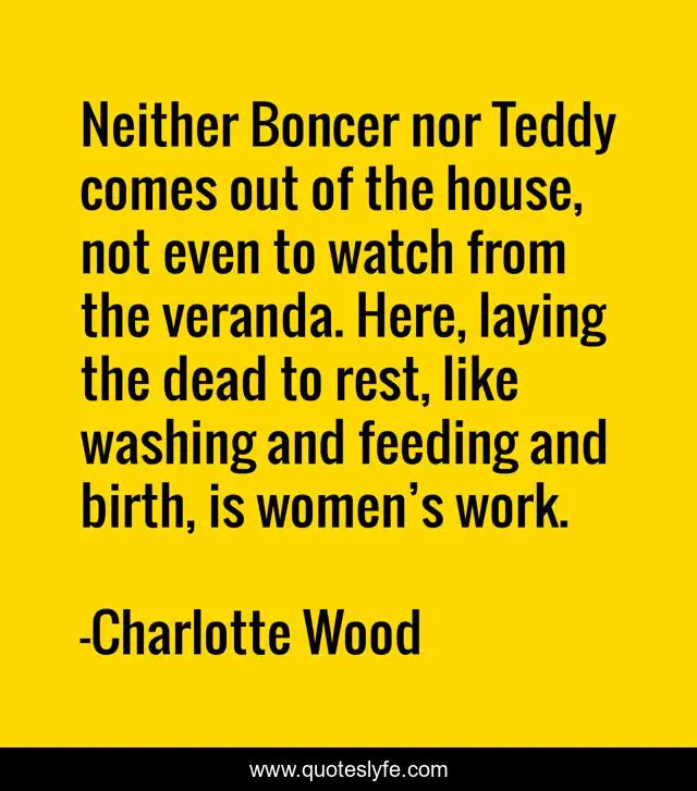 This page presents the quote "Neither Boncer nor Teddy comes out of the house, not even to watch from the veranda. Here, laying the dead to rest, like washing and feeding and birth, is women’s work.". Author of this quote is Charlotte Wood. This quote is about death, women,.