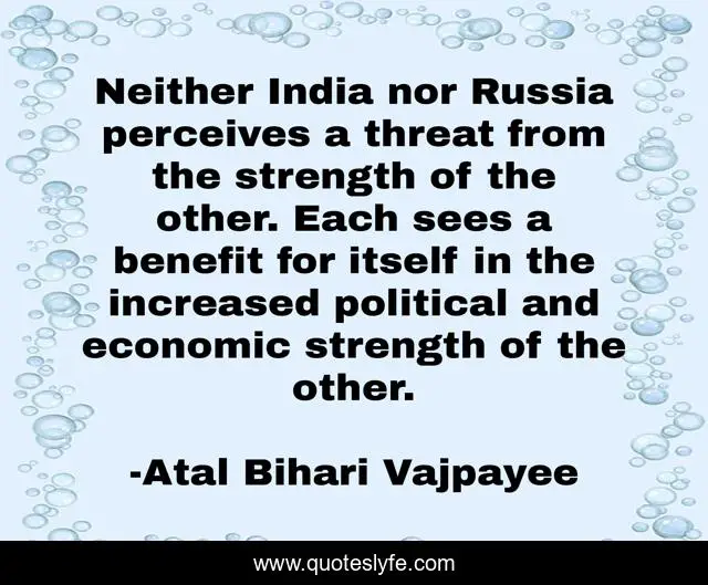 This page presents the quote "Neither India nor Russia perceives a threat from the strength of the other. Each sees a benefit for itself in the increased political and economic strength of the other.". Author of this quote is Atal Bihari Vajpayee. This quote is about political, economic, india,.