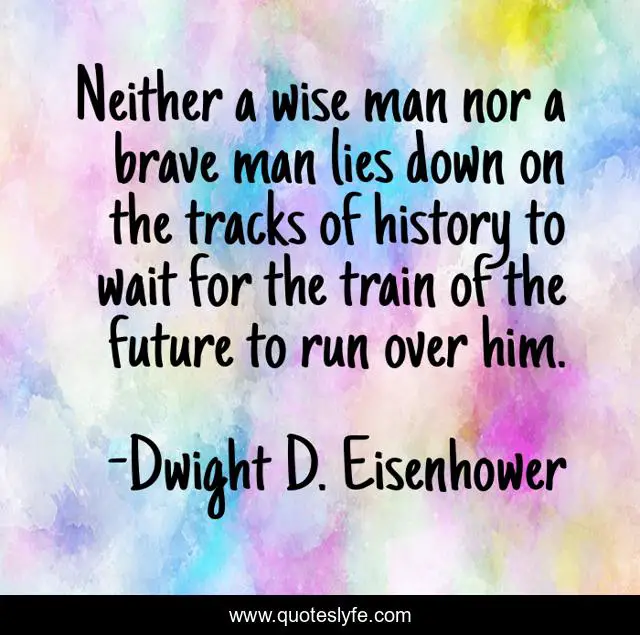 This page presents the quote "Neither a wise man nor a brave man lies down on the tracks of history to wait for the train of the future to run over him.". Author of this quote is Dwight D. Eisenhower. This quote is about future, wise, man,.