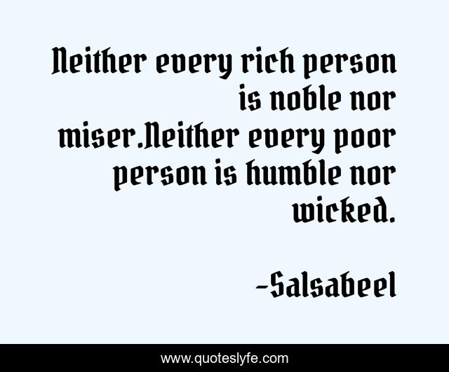 This page presents the quote "Neither every rich person is noble nor miser.Neither every poor person is humble nor wicked.". Author of this quote is Salsabeel. This quote is about noble, poor-people, rich-people, humble, human, miser, wicked,.