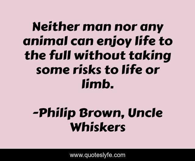 This page presents the quote "Neither man nor any animal can enjoy life to the full without taking some risks to life or limb.". Author of this quote is Philip Brown, Uncle Whiskers. This quote is about enthusiasm, cats, adventure, inspirational,.
