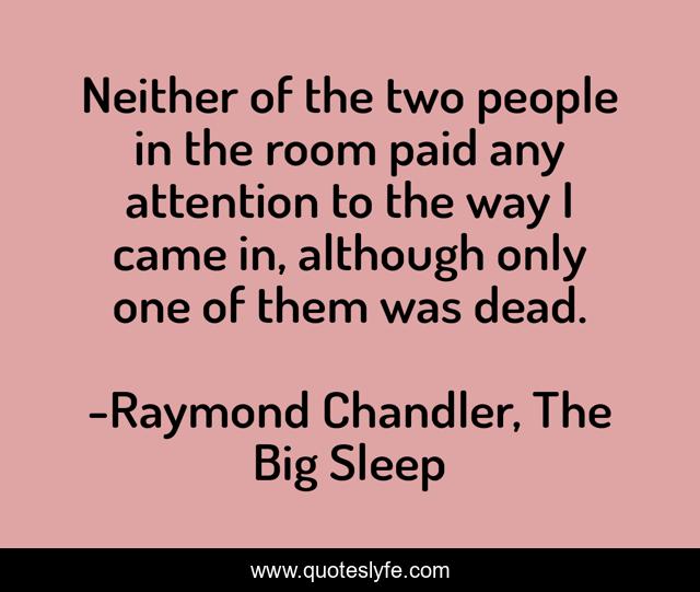 This page presents the quote "Neither of the two people in the room paid any attention to the way I came in, although only one of them was dead.". Author of this quote is Raymond Chandler, The Big Sleep. This quote is about death, humour,.
