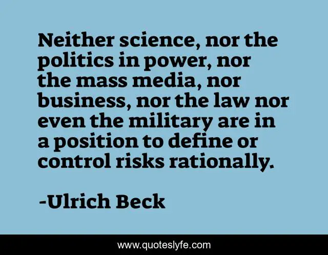 This page presents the quote "Neither science, nor the politics in power, nor the mass media, nor business, nor the law nor even the military are in a position to define or control risks rationally.". Author of this quote is Ulrich Beck. This quote is about science, power, politics,.