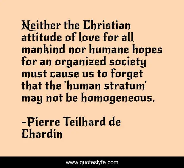 This page presents the quote "Neither the Christian attitude of love for all mankind nor humane hopes for an organized society must cause us to forget that the 'human stratum' may not be homogeneous.". Author of this quote is Pierre Teilhard de Chardin. This quote is about society, christian, affection, love,.