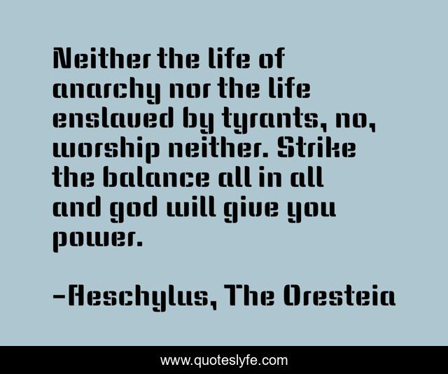 This page presents the quote "Neither the life of anarchy nor the life enslaved by tyrants, no, worship neither. Strike the balance all in all and god will give you power.". Author of this quote is Aeschylus, The Oresteia. .