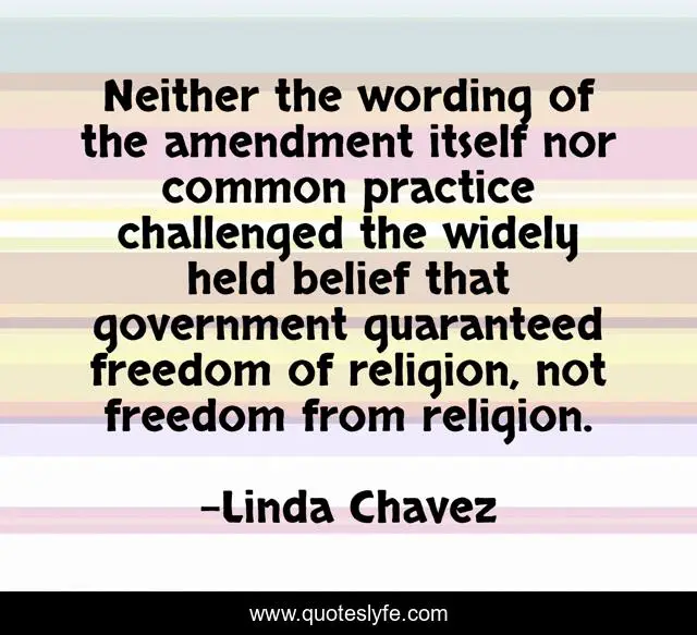 This page presents the quote "Neither the wording of the amendment itself nor common practice challenged the widely held belief that government guaranteed freedom of religion, not freedom from religion.". Author of this quote is Linda Chavez. This quote is about freedom, government,.