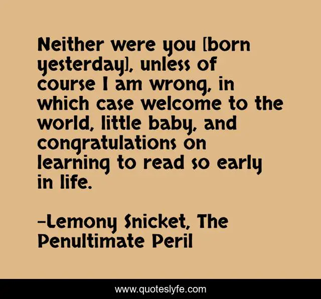 This page presents the quote "Neither were you [born yesterday], unless of course I am wrong, in which case welcome to the world, little baby, and congratulations on learning to read so early in life.". Author of this quote is Lemony Snicket, The Penultimate Peril. .