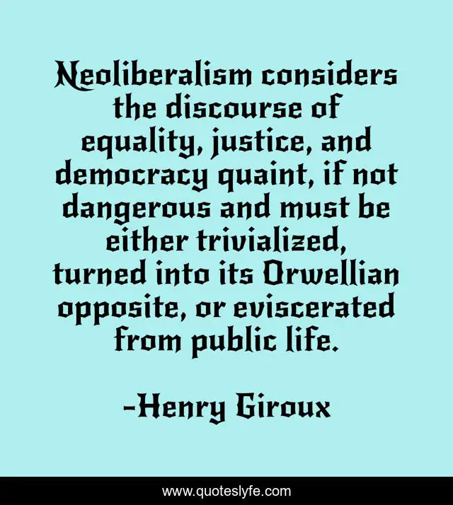 This page presents the quote "Neoliberalism considers the discourse of equality, justice, and democracy quaint, if not dangerous and must be either trivialized, turned into its Orwellian opposite, or eviscerated from public life.". Author of this quote is Henry Giroux. This quote is about justice, life, democracy,.
