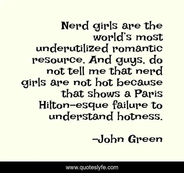 This page presents the quote "Nerd girls are the world’s most underutilized romantic resource. And guys, do not tell me that nerd girls are not hot because that shows a Paris Hilton-esque failure to understand hotness.". Author of this quote is John Green. This quote is about romance, nerdiness, nerdfighters,.