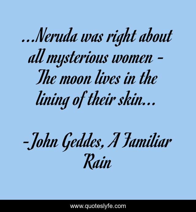 This page presents the quote "...Neruda was right about all mysterious women - The moon lives in the lining of their skin...". Author of this quote is John Geddes, A Familiar Rain. This quote is about mysterious, neruda, moon, women,.