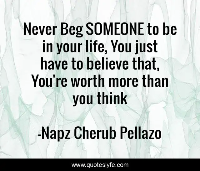 This page presents the quote "Never Beg SOMEONE to be in your life, You just have to believe that, You're worth more than you think". Author of this quote is Napz Cherub Pellazo. This quote is about life, someone, inspirational, enthusiasm, believe, worth,.