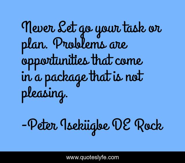 This page presents the quote "Never Let go your task or plan. Problems are opportunities that come in a package that is not pleasing.". Author of this quote is Peter Isekiigbe DE Rock. This quote is about problem, task, plan,.