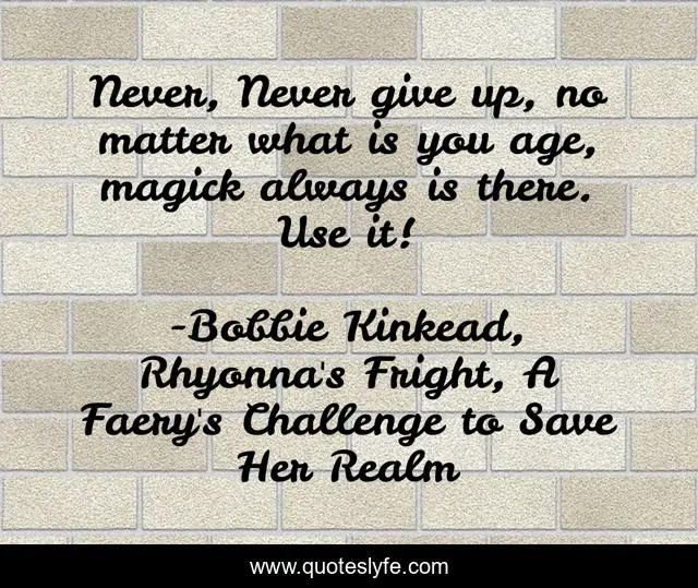 This page presents the quote "Never, Never give up, no matter what is you age, magick always is there. Use it!". Author of this quote is Bobbie Kinkead, Rhyonna's Fright, A Faery's Challenge to Save Her Realm. This quote is about winning-and-losing, challenge, flying, fantasy, adventure, trust, friendship,.