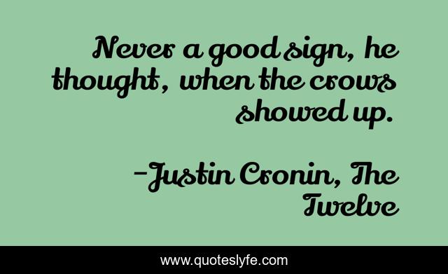 This page presents the quote "Never a good sign, he thought, when the crows showed up.". Author of this quote is Justin Cronin, The Twelve. This quote is about harbinger, vampires, creepy, crows, armageddon, apocalypse, dark-humor,.