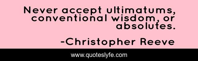 This page presents the quote "Never accept ultimatums, conventional wisdom, or absolutes.". Author of this quote is Christopher Reeve. This quote is about accept, ultimatums,.