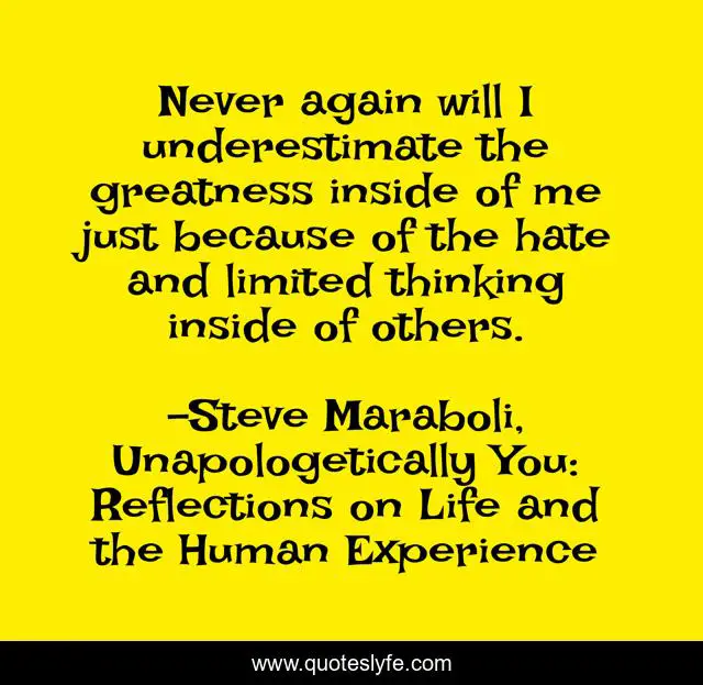 This page presents the quote "Never again will I underestimate the greatness inside of me just because of the hate and limited thinking inside of others.". Author of this quote is Steve Maraboli, Unapologetically You: Reflections on Life and the Human Experience. This quote is about life, success, people, thinking, greatness, hate, happiness,.