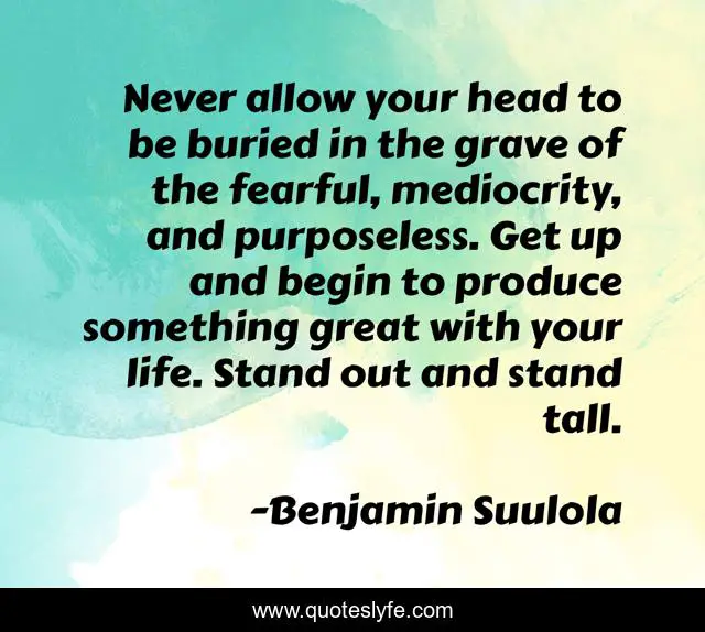 This page presents the quote "Never allow your head to be buried in the grave of the fearful, mediocrity, and purposeless. Get up and begin to produce something great with your life. Stand out and stand tall.". Author of this quote is Benjamin Suulola. This quote is about courageous-leadership, destiny, mediocrity, benjamin-suulola, fearless, fear-of-god, greatness, mediocrity-and-happiness, courage,.