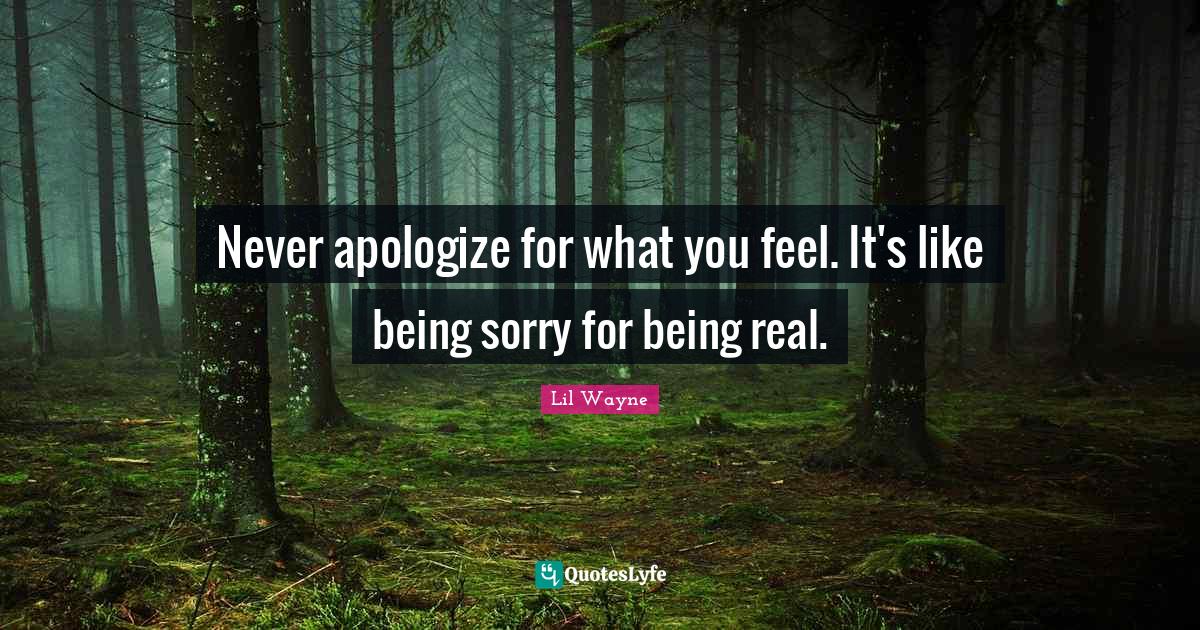 This page presents the quote "Never apologize for what you feel. It's like being sorry for being real.". Author of this quote is Lil Wayne. This quote is about being sorry, sorry, being real, real, inspiration,.