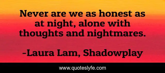 This page presents the quote "Never are we as honest as at night, alone with thoughts and nightmares.". Author of this quote is Laura Lam, Shadowplay. This quote is about nightmares, thoughts,.