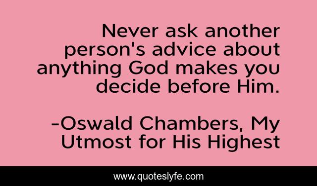 This page presents the quote "Never ask another person's advice about anything God makes you decide before Him.". Author of this quote is Oswald Chambers, My Utmost for His Highest. .
