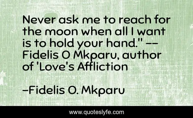 This page presents the quote "Never ask me to reach for the moon when all I want is to hold your hand." -- Fidelis O Mkparu, author of 'Love's Affliction". Author of this quote is Fidelis O. Mkparu. This quote is about goals-in-life, love, goals, affection, ambition,.