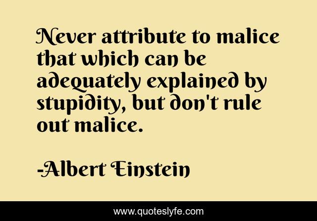This page presents the quote "Never attribute to malice that which can be adequately explained by stupidity, but don't rule out malice.". Author of this quote is Albert Einstein. This quote is about stupidity, albert-einstein, wired-for-war,.